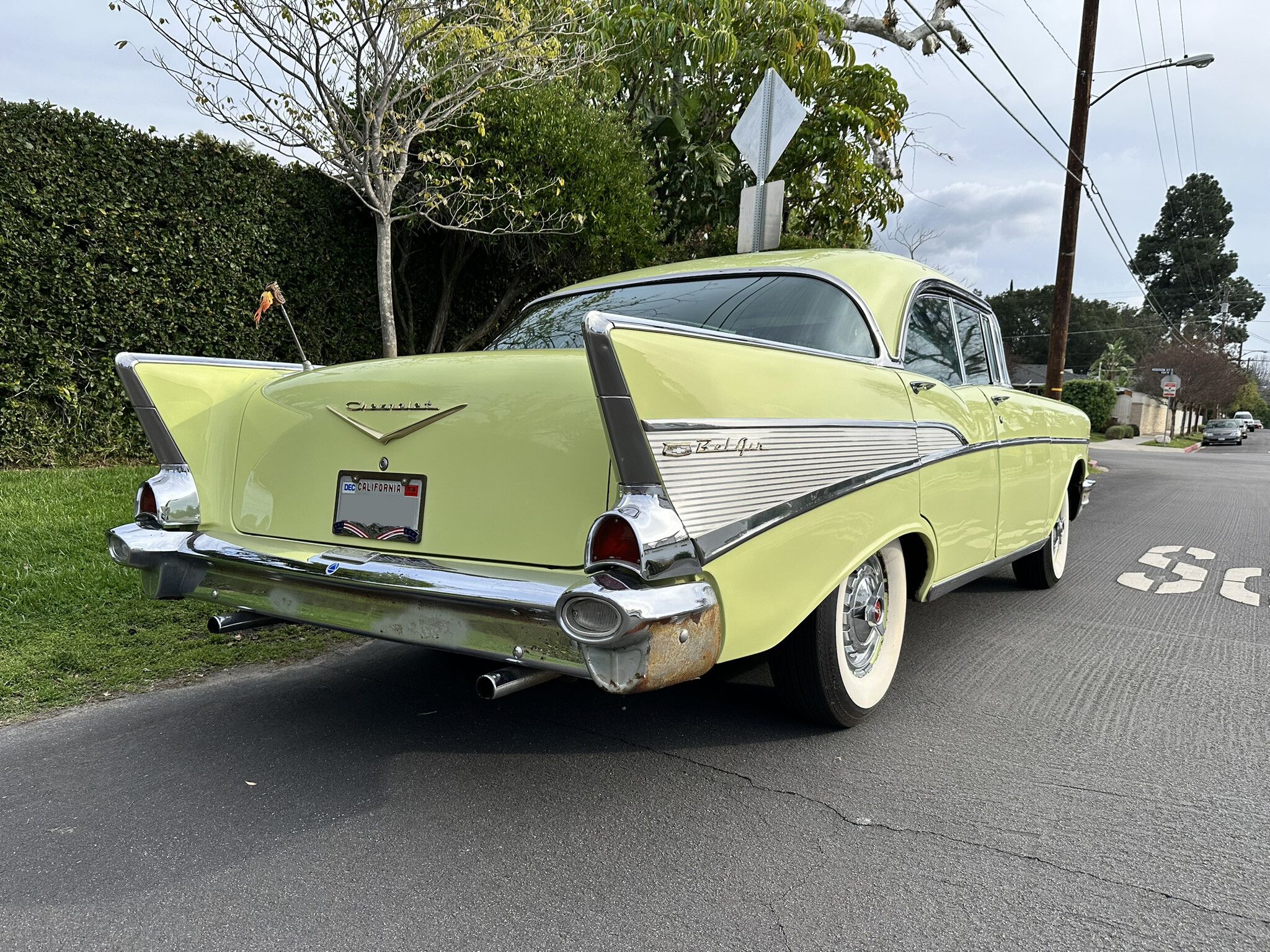 This vehicle will be sold on a clean California title in the seller and his wife's names. This 1957 Chevrolet Bel Air Sport Sedan has been in the seller's family since new. The seller sums up the car as "an unmolested classic in pretty good shape" and adds, "The color is amazing--a total head-turner."