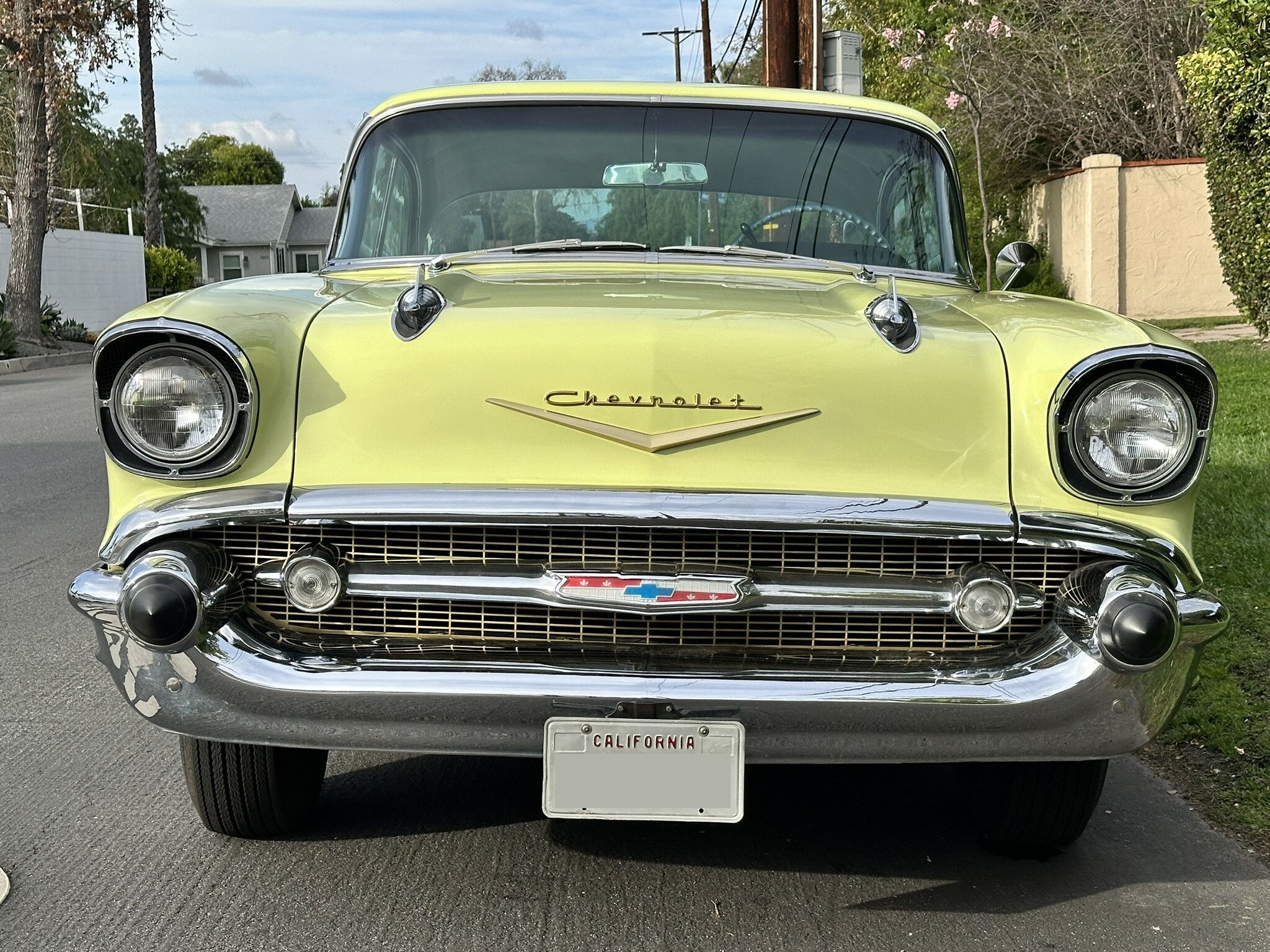 This 1957 Chevrolet Bel Air Sport Sedan was originally purchased by the seller's grandfather in Portland, Oregon. After his 1963 passing, the car was little used and mostly garaged until 1990, when it was acquired by the seller. Some right fender repairs were made and the Bel Air was repainted solid yellow, a brighter shade than the car's original Colonial Cream, a pale yellow. This four-door hardtop Sport Sedan is one of 137,672 produced in 1957.